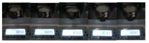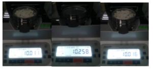 2. 將防風(fēng)盤、支架、樣品盤一一裝好,接通電源,按下開機(jī)鍵,顯示屏進(jìn)入開機(jī)界面,首先按去皮鍵減去樣品盤重量,后將100g砝碼放入托盤進(jìn)行校準(zhǔn);