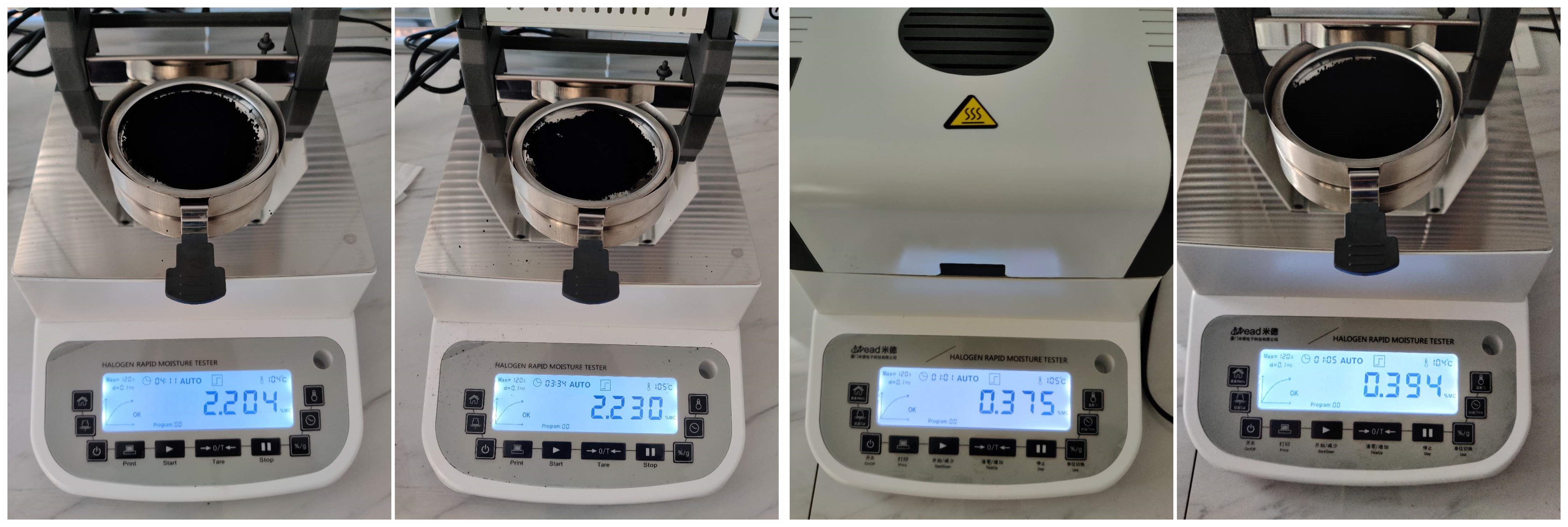 - 用樣品勺取適量充分暴露在空氣中的碳黑粉末均勻鋪在樣品盤上,設(shè)置好合適的溫度后蓋下上蓋,按下“START”鍵開始測試;蜂鳴兩聲后,儀器自動停機(jī),測試結(jié)束,可在液晶顯示屏查看被測粉體的水分含量為2.204%;