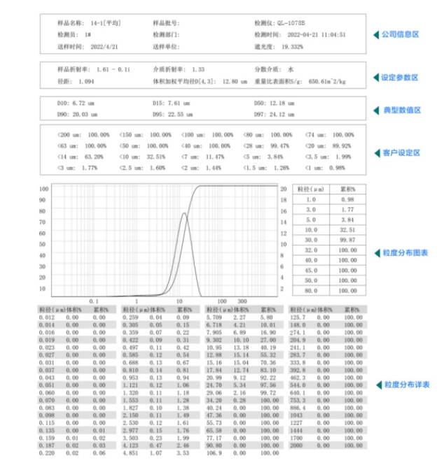| 顯示模板 | 粒徑區(qū)間求百分比,以滿足不同行業(yè)對粒度測試的表征方式。徑距、一致性、區(qū)間累積等等 |